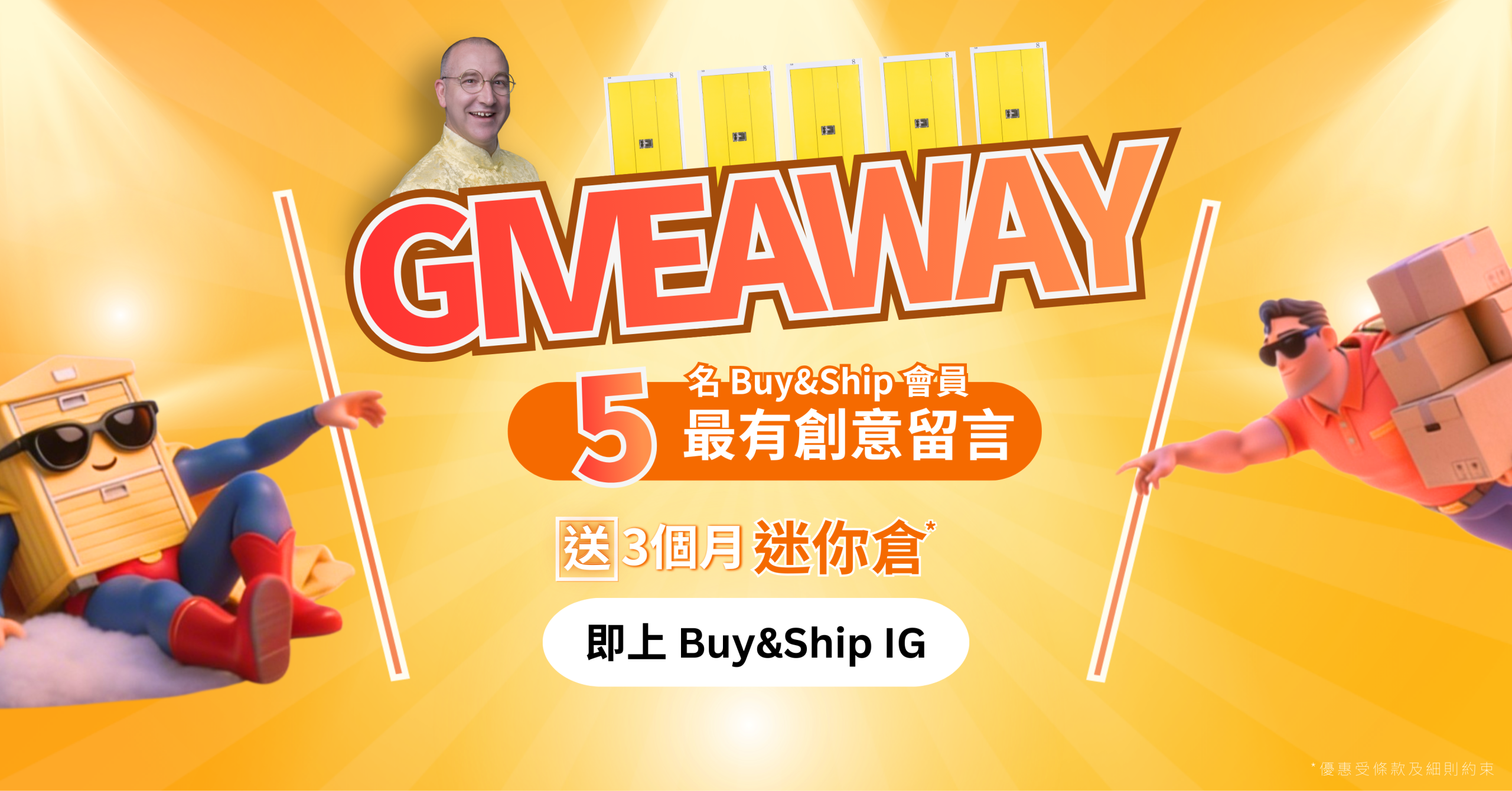 於 3 月 16 日至 3 月 20 日期間,追蹤 Buy&Ship 官方 Instagram 帳號 @buyandship.goodies 並完成指定 4 個步驟,即可參加 Giveaway,有機會贏取 3️⃣ 個月免費時昌迷你倉使用權! 得獎名單將於 3 月 27 日在本活動頁面公布,並由官方 Instagram 帳號以私訊方式聯絡得獎者。名額共5名!
