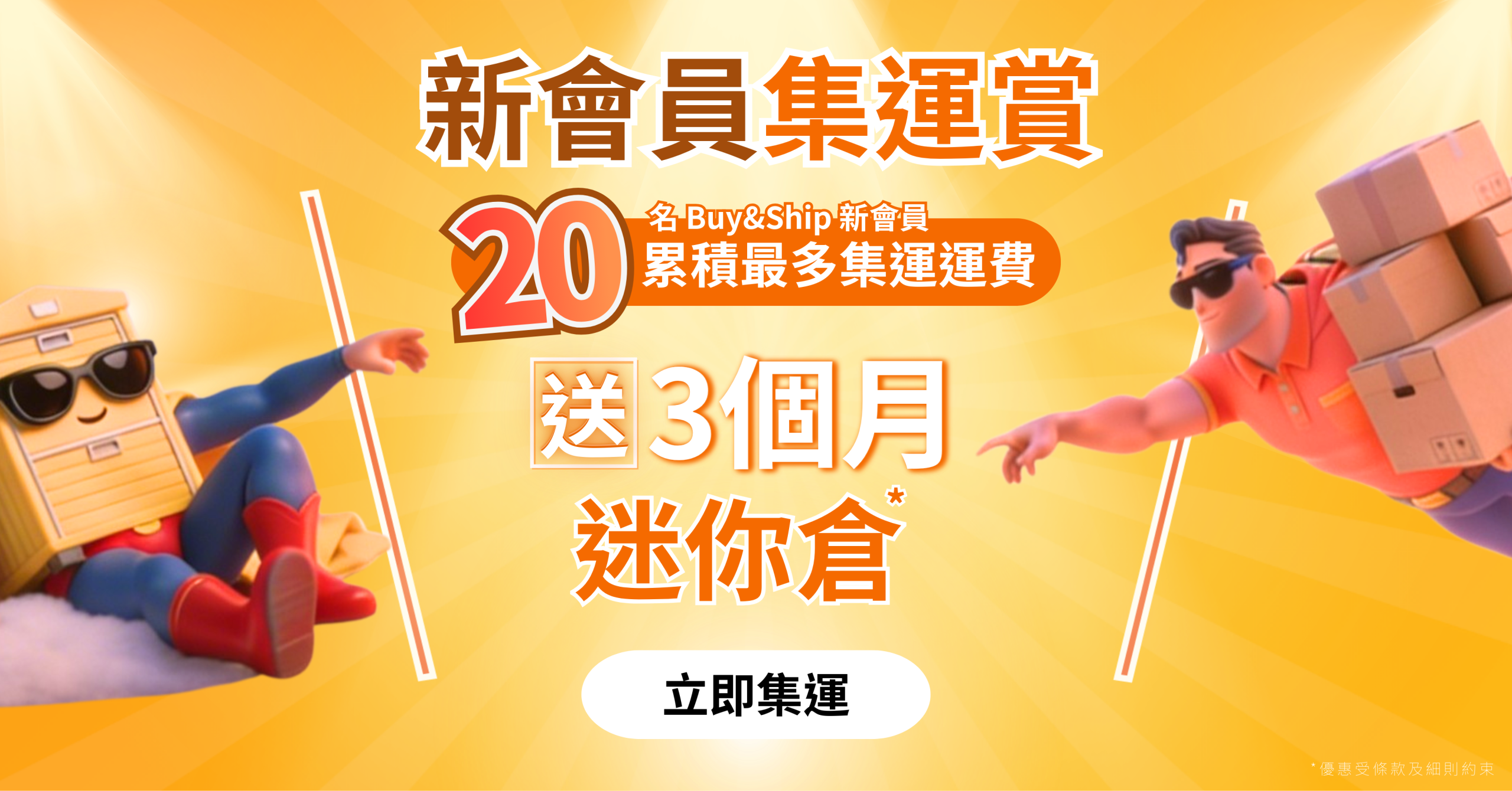 集運愈多,機會愈高👑 活動分為兩個階段獨立計算。於每個階段內,新註冊成為 Buy&Ship 會員並累積集運金額最高的前 10 名會員,可獲 3️⃣ 個月指定時昌迷你倉免費名額,名額共20名!