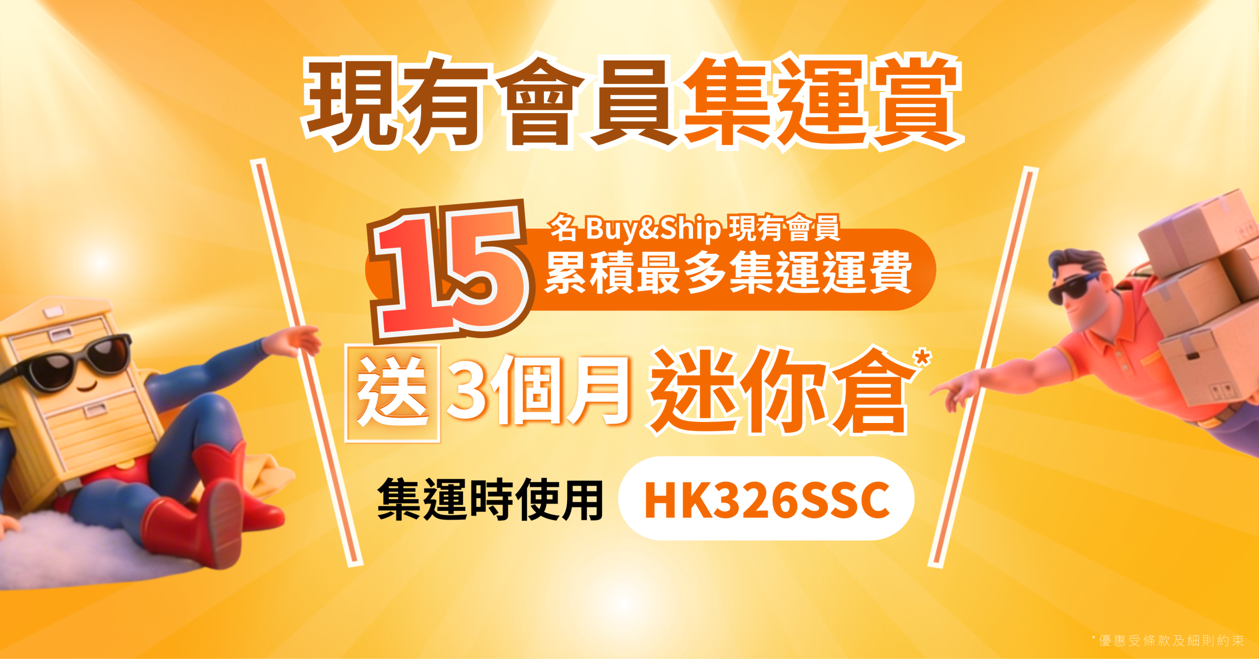 買得更盡興📦!現有會員於合併轉運單時輸入優惠碼「HK326SSC」,即可參加活動!活動期間內,累計最高合資格集運運費的前 15 名現有會員,可獲 3️⃣ 個月指定時昌迷你倉免費名額!