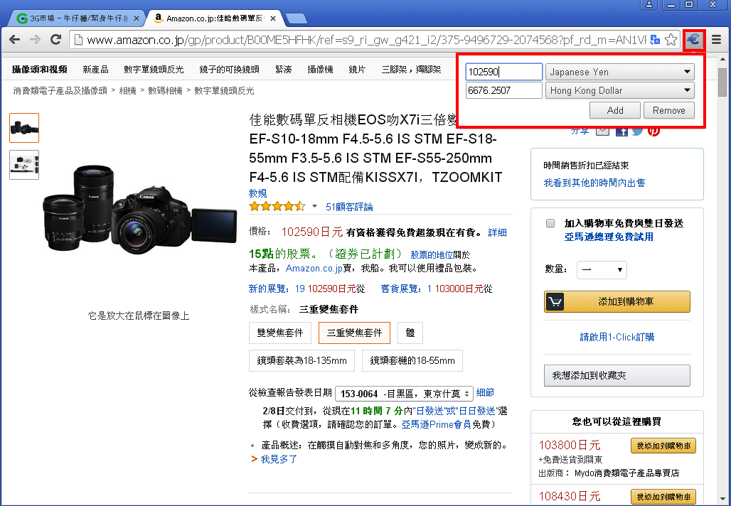另一個要推介的是 Chrome 的一個 Extension,叫 Currency Converter,安裝了之後就能很容易地一邊購物,一邊查詢滙價,如下圖: