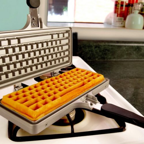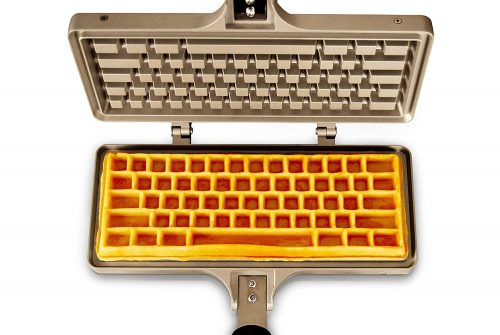 The Keyboard Waffle Iron 係一個鍵盤型窩夫製作器,配有隔熱手柄,安全而且用法非常簡單,只需要在煮食器(火爐,燒烤爐或烤架)上以中大火預熱,塗上少量油,然後加入 3/4 杯麵糊,每分鐘轉邊一次,以中大火每邊煮3-4分鐘,即可食用。