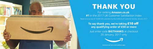 英國 Amazon 被英國消費者評為最滿意網站!Amazon UK 為咗回饋用戶,推出一日限定大優惠:買滿£50即減£10!