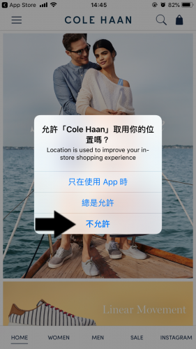 今次會以 iPhone 作示範,下載好個 App 就可以開始買買買喇!有一步係非常重要嘅,當見到呢個「允許 Cole Haan 取用你的位置嗎?」嘅 Pop-up 時記得係要揀不允許!