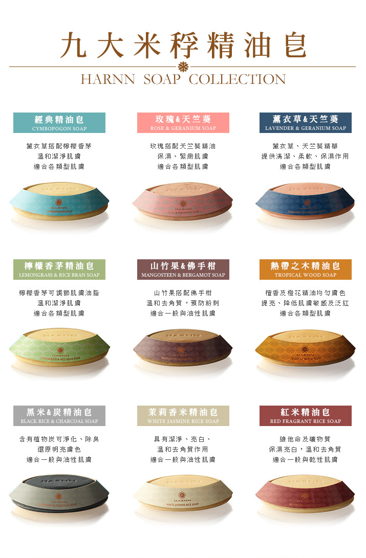 唔少人都當泰國係第二個家鄉,啲嘢又平又靚又好用,特別係各類精油產品,對比之下真係平過香港好多架!Harnn 呢個牌子亦係唔少人去泰國必買之一,當中就以米稃精油皂最出名!佢以米稃油為基底,夠哂滋潤又可以保護肌膚,加上米殼顆粒可以喺沐浴同時去角質,一舊皂就有多重功效,難怪成為皇牌產品!想買嚟試吓或者要補貨的話都唔洗飛一轉嘅,上佢哋台灣官網一樣買得到呀!
