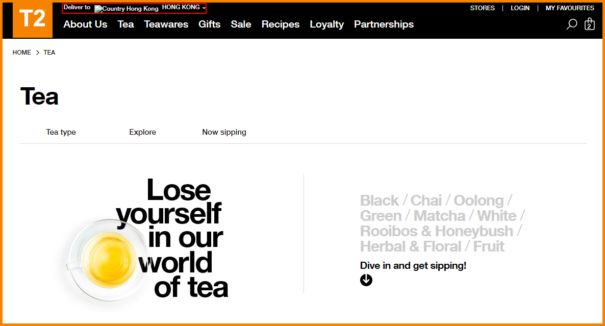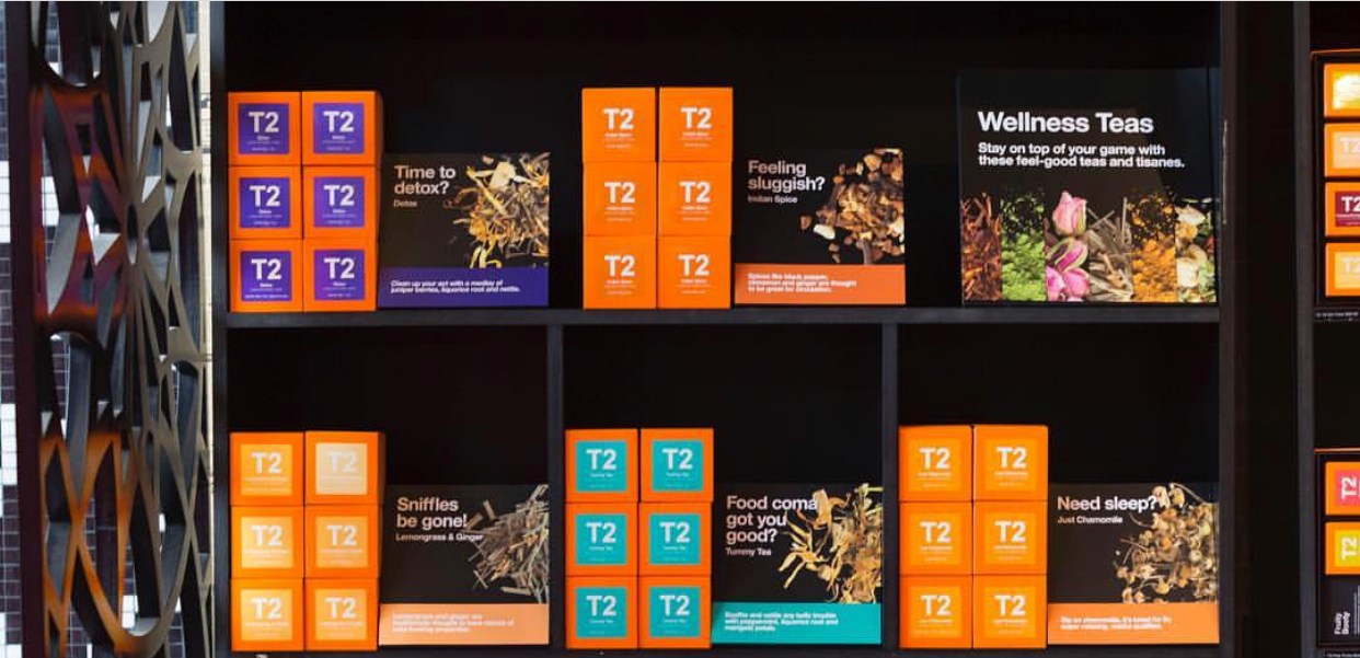 英國茶葉品牌有 Twinings、Fortnum & Mason、Whittard 等做代表,而澳洲就有呢間以橙黑色為主調嘅 T2 Tea!品牌創立已經超過 20 年,被稱為最時尚嘅茶飲店。T2 有超過 100 種茶葉選擇,茶葉嚟自世界各地,口味包括日本抹茶、煎茶,英式紅茶、水果茶,印度拉茶以及澳洲早餐茶等等。T2 嘅茶包都係三角立體茶包,茶葉喺沖泡時可以有足夠空間,令茶香及味道可以完全釋放。