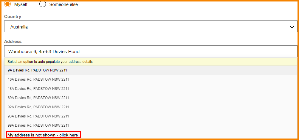 然後根據「海外倉庫地址」一頁填寫澳洲倉庫地址,於 Address 一欄貼上地址後揀選「My address is not shown – click here」。
