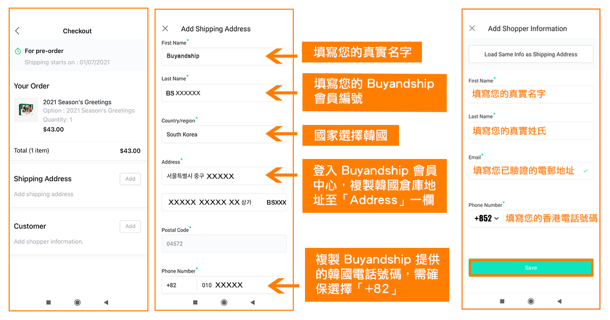 確保購物車內的商品正確無誤後,就可以按「Check Out」進行付款,並跟足上圖填寫 Shipping Address 及 Customer 資料。登入會員中心後就可以找到 Buyandship 韓國倉庫地址及用作網購的韓國電話號碼,複製貼上便可,留意在 Shipping Address 的 Last Name 一欄需要寫上 Buyandship 會員編號。若尚未註冊成為 Buyandship 會員,立即按此註冊及領取 $12 運費迎新優惠!