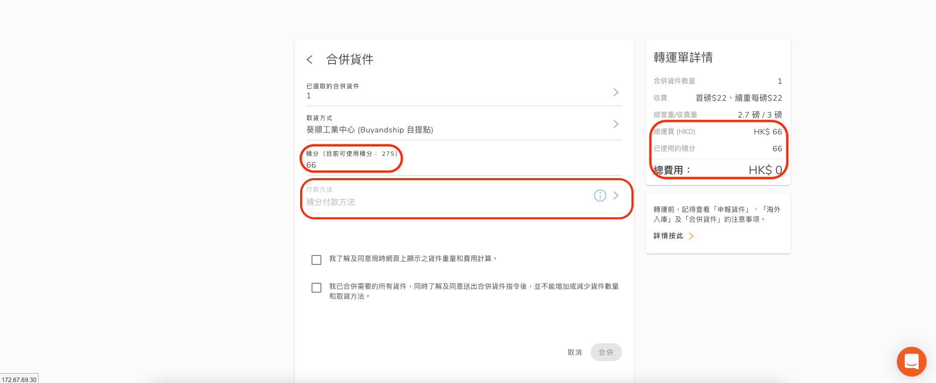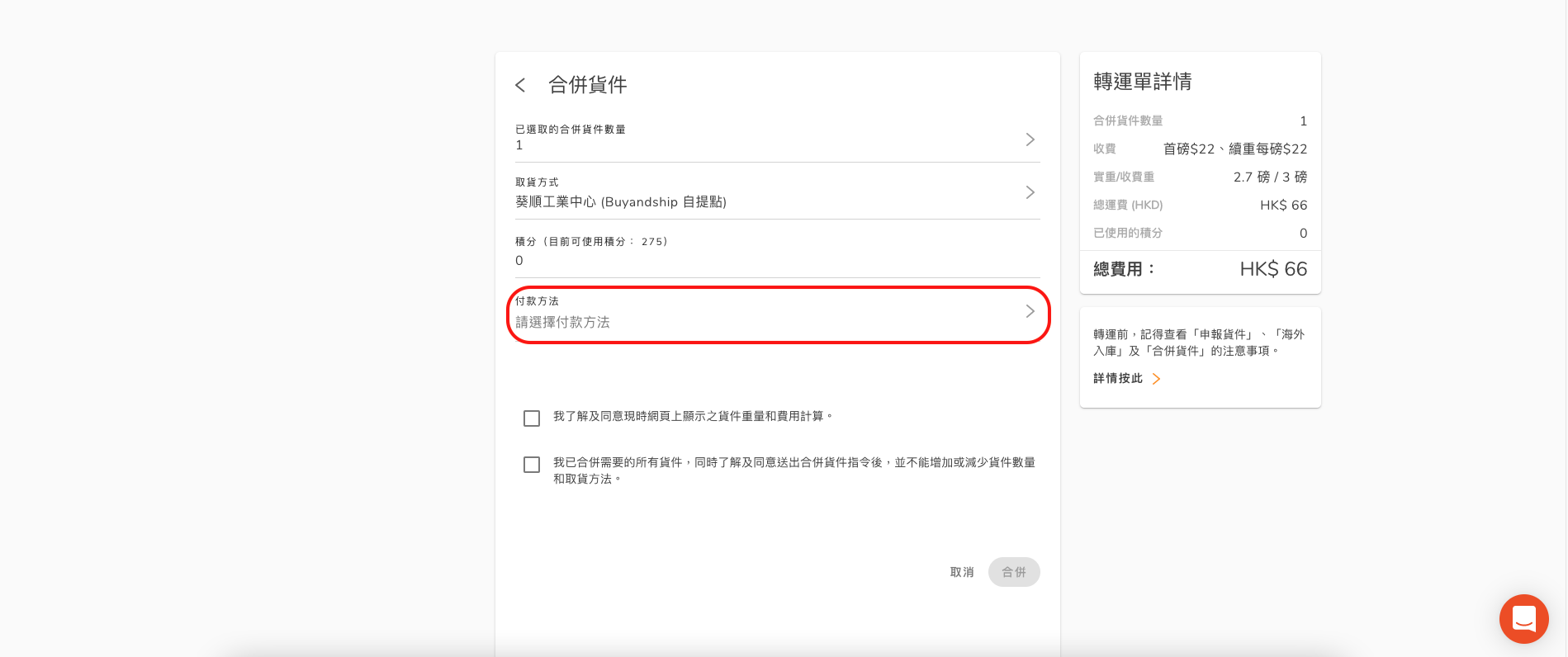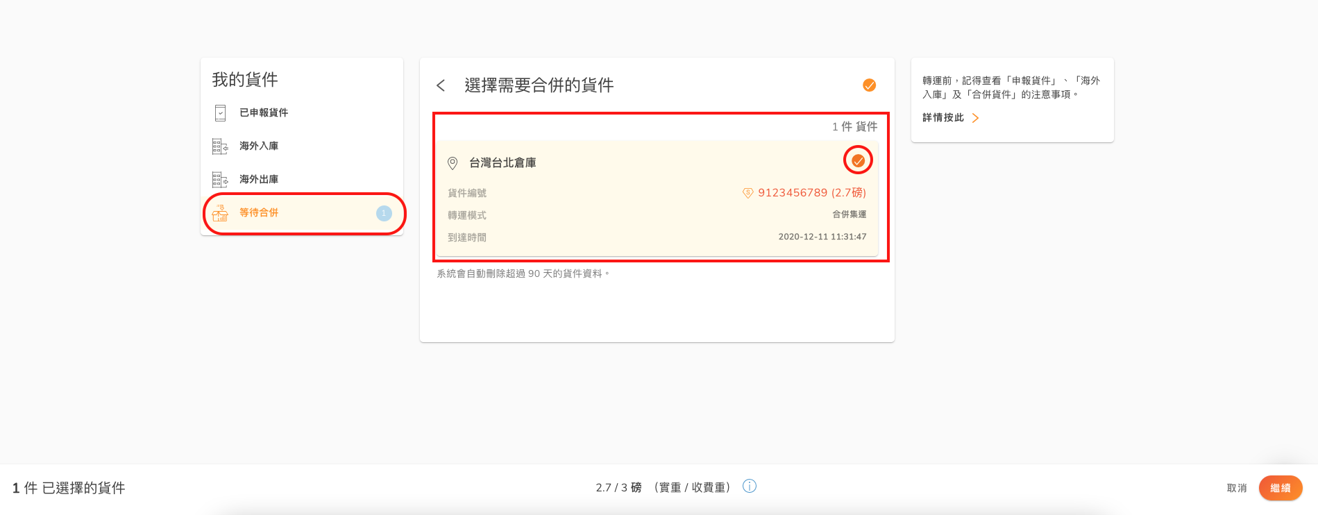 當你的貨件抵達到香港倉庫時,便會收到我們的貨件到港電郵通知,此時可於 我的貨件 中「等待合併」一欄,選取你想要集單的所有貨件。