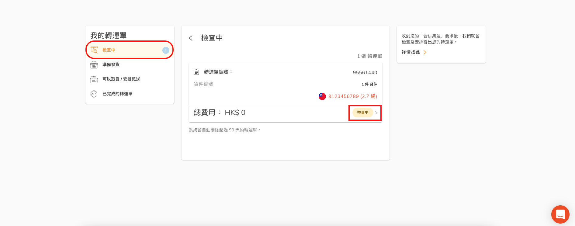 填寫完畢及確認所有貨件的取貨方式後,貨件便會自動轉到「我的轉運單」,這時候只需要等待取貨通知則可。