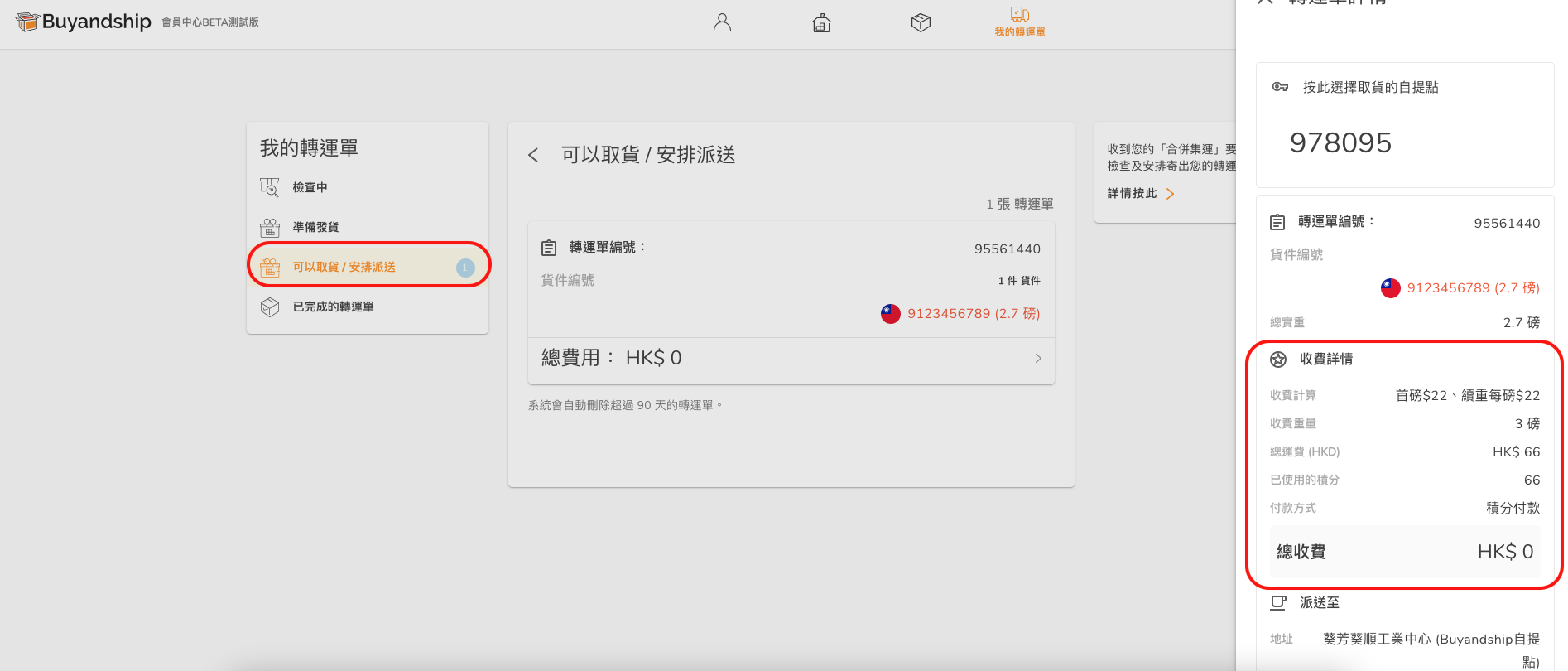 當你收到取貨通知電郵時,便可在「我的轉運單」看到你的貨件已顯示在「可以取貨/安排派送」一欄裡,並顯示「積分付款」及扣除積分後仍欠奉的總收費。