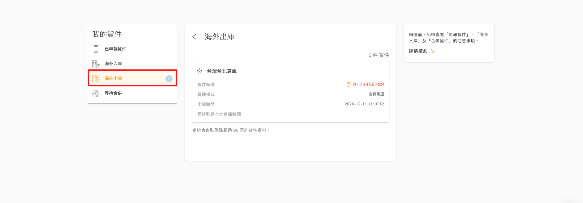 直至貨件被安排從海外倉庫出庫後,貨件狀態則會自動轉到「海外出庫」一欄,這時候還不需要任何操作,只需等待貨件轉運去香港。