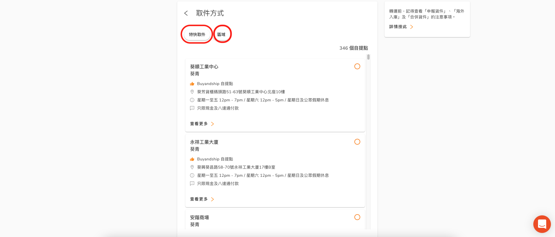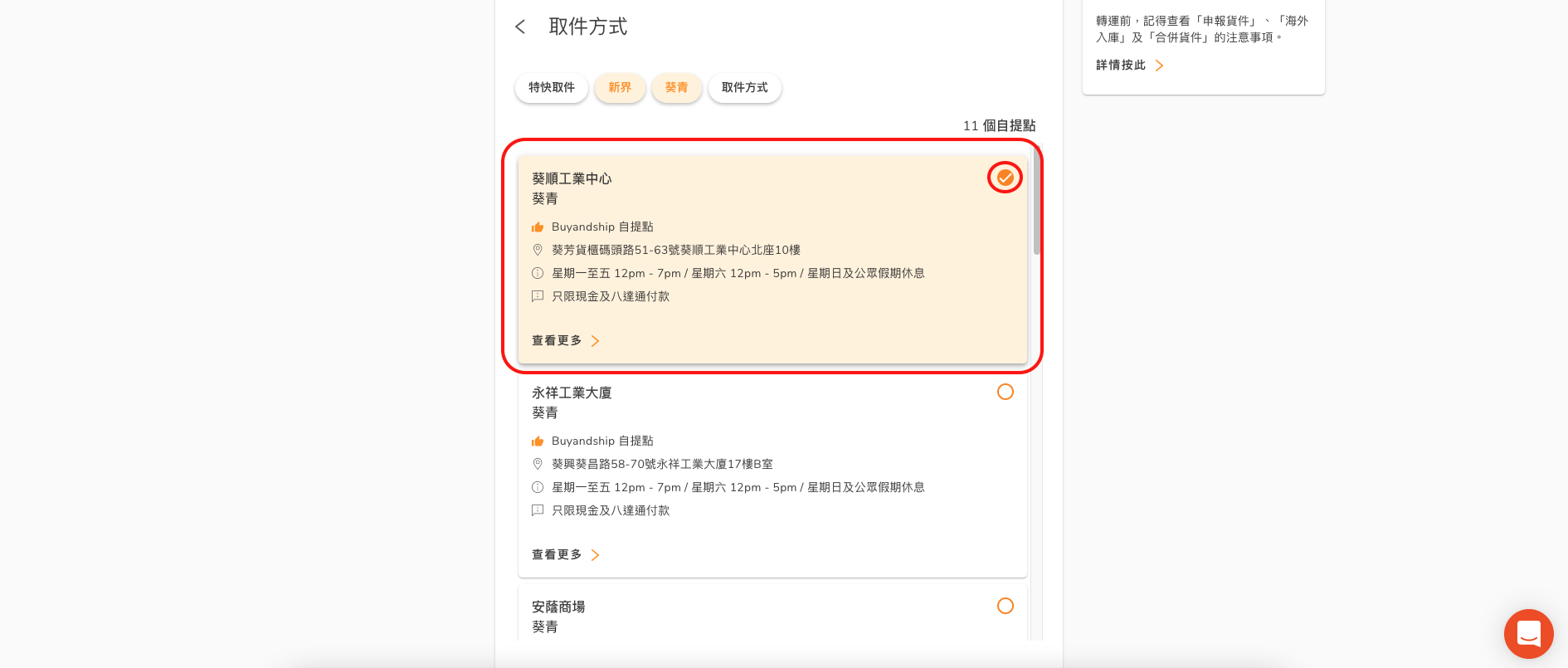 「區域」= 其他自提點小編揀選了「Buyandship 自提點」的「葵順工業中心」。