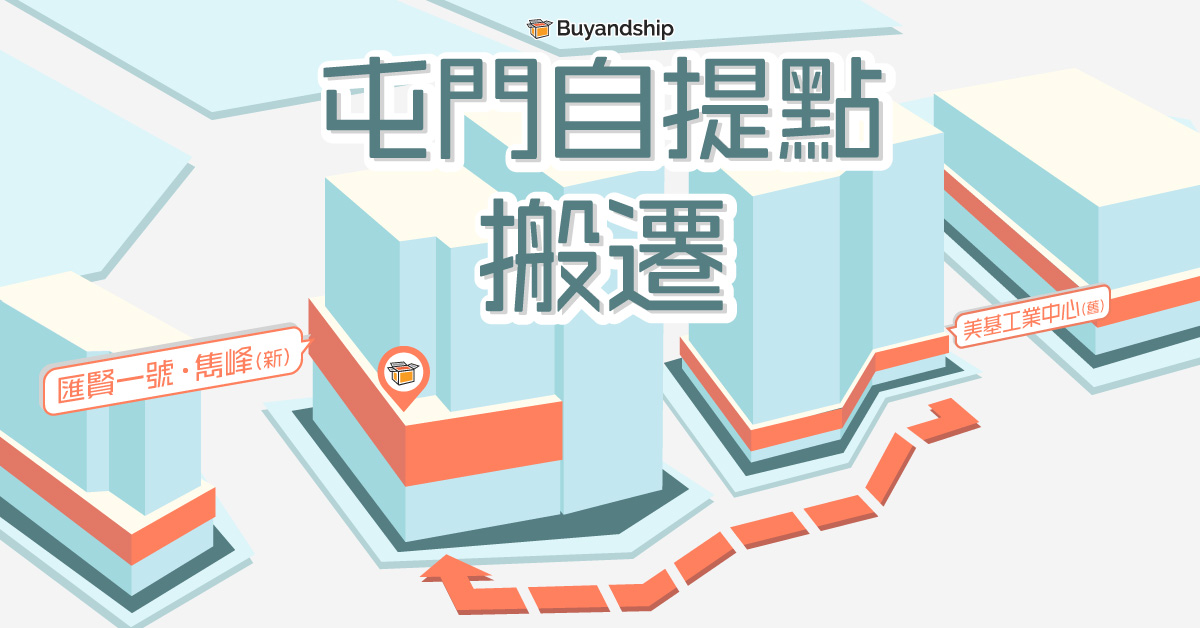 屯門自提點搬遷 16/08/2021 2021 年 8 月 23 日(星期一)起,Buyandship 屯門自提點將搬至鄰近的匯賢一號·雋峰繼續為會員提供服務。 屯門自提點現址會於 8 月 21 日(星期六)晚上 7 點起正式停止服務,其後仍未領取的貨件將會轉送至新地址領取。新地址詳情如下: 屯門自提點新地址 屯門新合里 3 號匯賢一號·雋峰 19 樓 8 室 (距離現址美基工業中心 1 分鐘路程) 到付方式:只接受現金,暫不接受八達通付款。 不便之處,敬請留意。