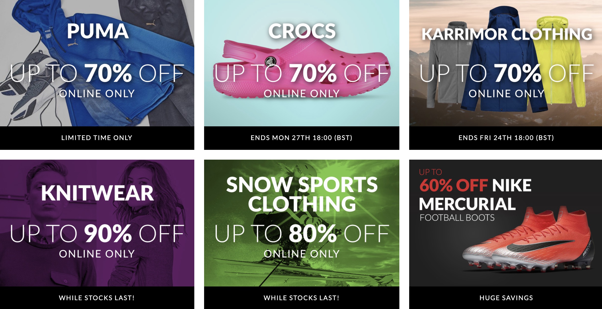 Sports Direct官網隨時都有各大品牌進行促銷優惠,此外還有低至三折的Weekly Offer專區,週週都會推出不同款式進行三折優惠,除了令人驚喜的優惠價,OUTLET專區還可以鎖定你想要的品牌去尋找優惠,超級方便!