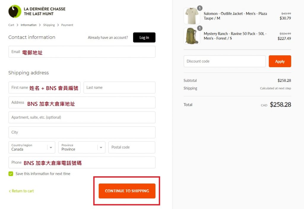 Step 3:填寫個人資料並打開 Buyandship 網站的「海外倉庫地址」,選擇「加拿大」,然後複製 Buyandship 加拿大倉庫的資料到適當的位置,然後點擊「Continue to Payment」。