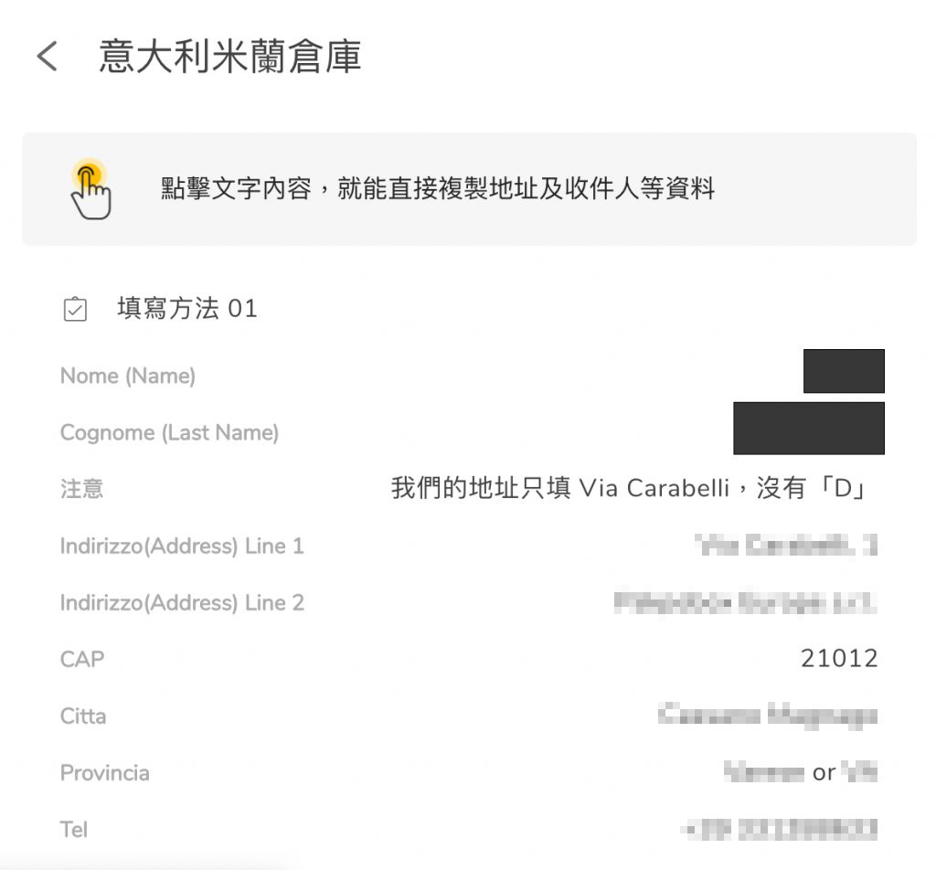 選擇「意大利米蘭倉庫」,便可以查看及複製 Buy&Ship 意大利倉庫的資料。