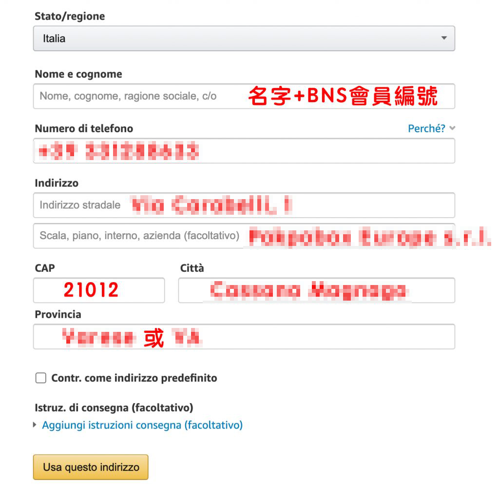 姓名部分需複製 Buy&Ship 地址資料的「Nome」和「Cognome」(包含名字及「BS」字頭的 Buy&Ship 會員編號)。