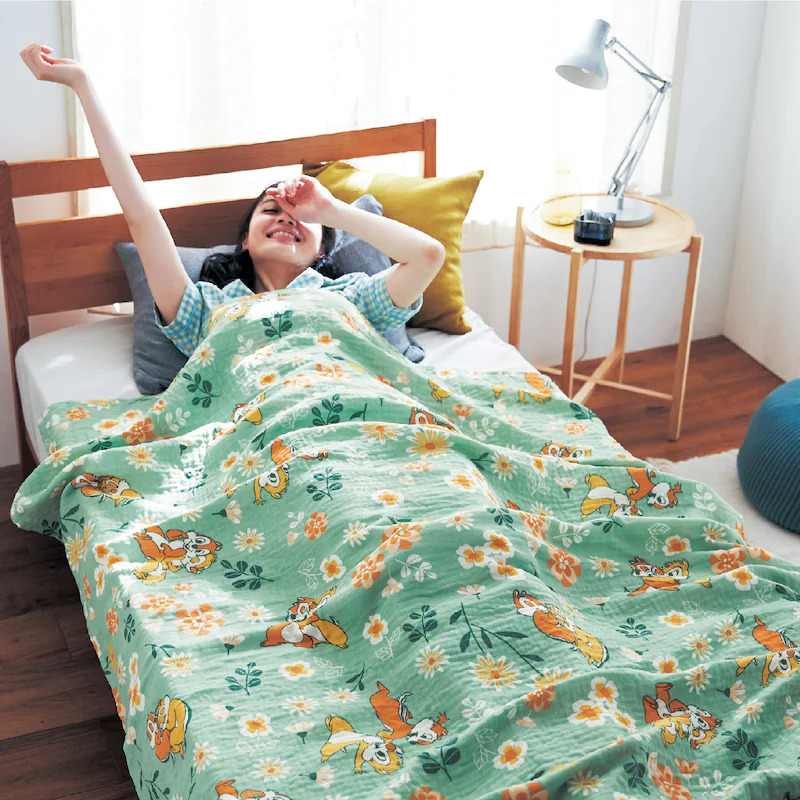 這款一年四季都可以使用紗巾棉被,採用四層紗巾製成,質地柔軟透氣,彷如嬰兒的面巾般舒服。設有兩個尺寸,適合大人和小孩。共有 5 款卡通主題可選,分別是小魚仙 Ariel、Chip 『n』 Dale、Winnie the Pooh、Mickey Mouse 及 Toy Story。