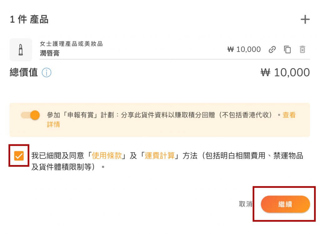 回到購物車頁面,點擊「Continue to checkout」。確認訂單無誤後,點擊「Place order」支付帳單。完成下單後你會收到確認訂單的電子郵件,記得要盡快前往 Buy&Ship 網站申報貨件。