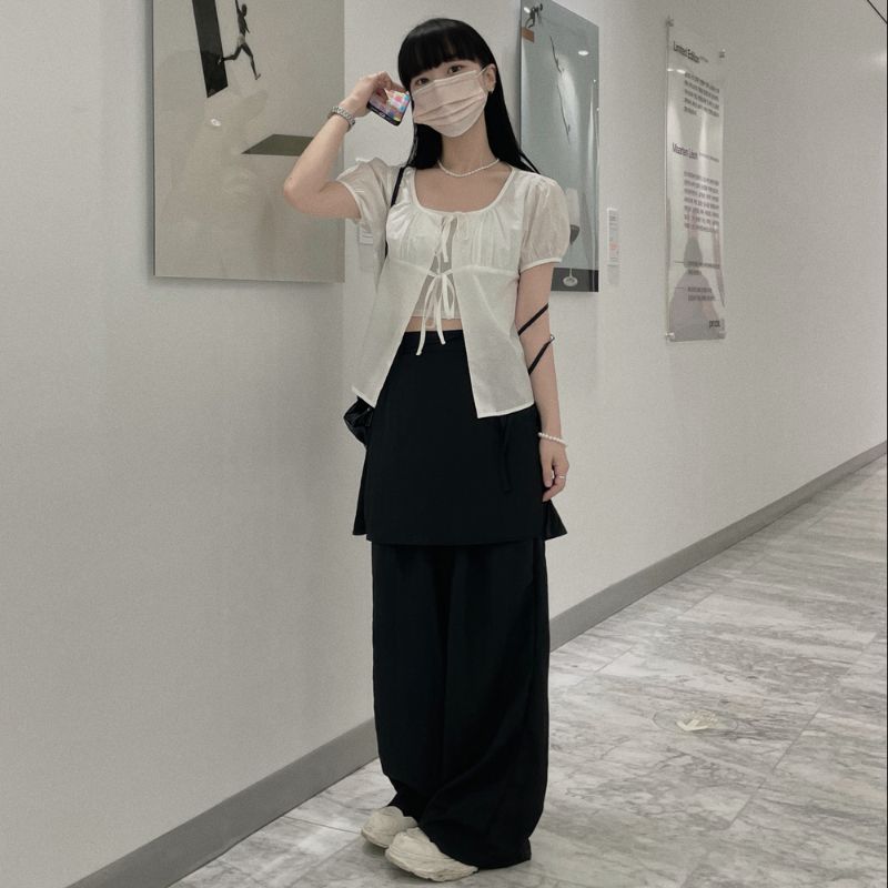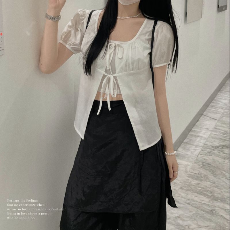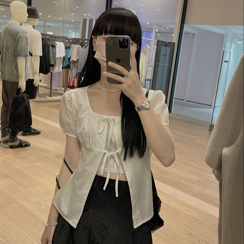 這款襯衣採用方領和公主袖設計,配上正面的綁帶蝴蝶結,外型甜美青春,質料較薄更透氣,配搭內穿小背心也不會焗悶,同時很有層次感~
