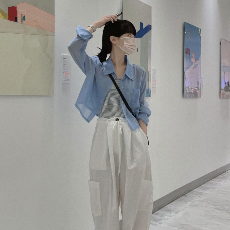 這款短版薄襯衫十分適合在夏日配上小背心穿搭,不但有助修飾手臂線條,還令整體外觀更立體好看,更很透氣不會焗悶,同時短版設計配搭高腰長褲更顯腿長~