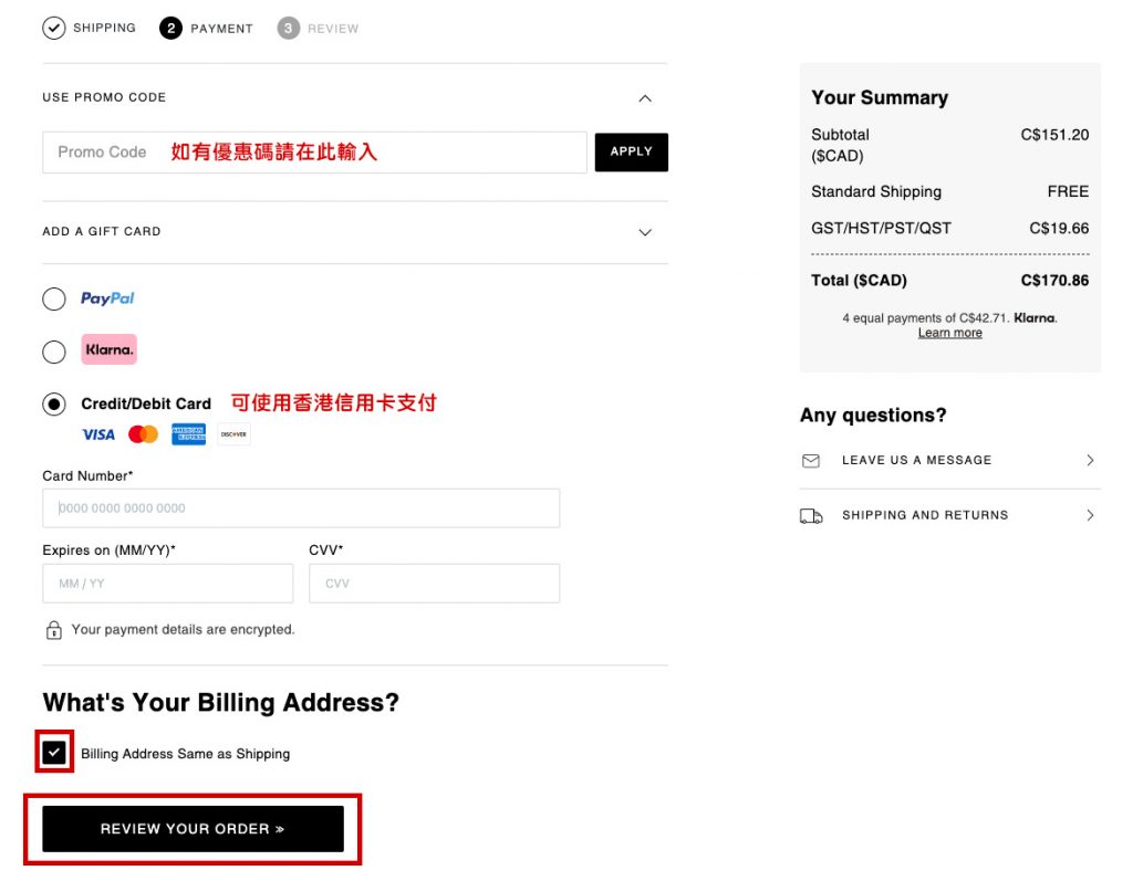 Billing Address 部分小編使用的是加拿大倉庫地址,若下單後被取消訂單可試試轉用信用卡註冊地址。