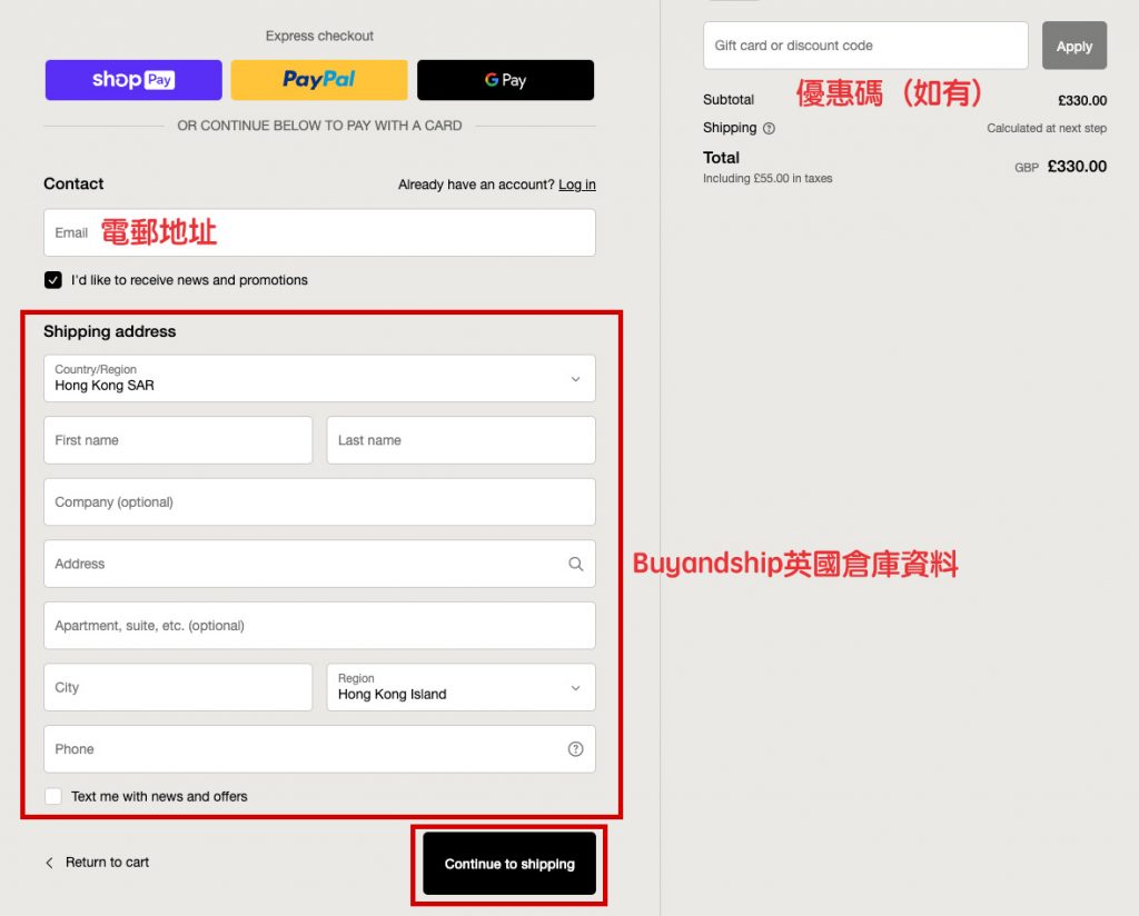 Step 5:填寫電郵地址,然後打開Buyandship網站複製貼上英國倉庫地址資料;如有折扣碼記得在右方輸入。