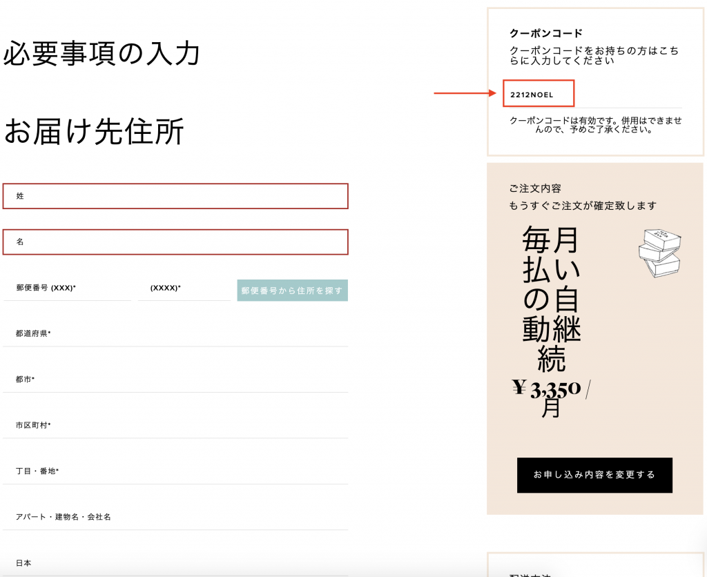Step 5:如有優惠碼,需在右上方輸入;再根據 Buyandship 的日本倉庫資料填寫姓名、Zip Code、地址、電話號碼,確認輸入正確後點擊下方黑色按鈕購入。