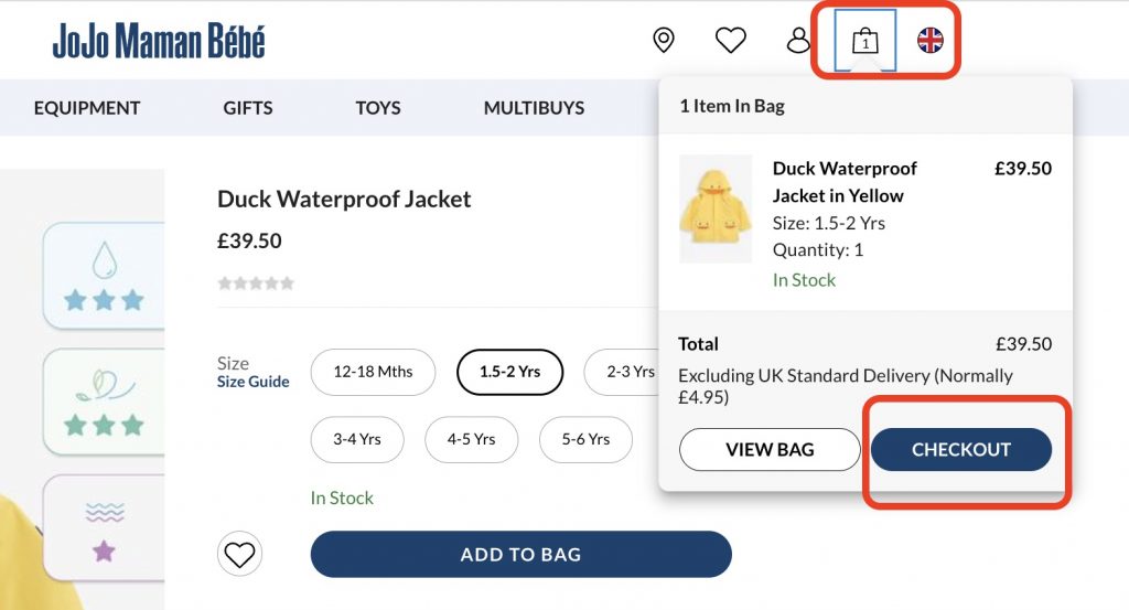 Step 1:於 JoJo Maman Bébé 的官網挑選心儀商品,選擇所需尺碼、數目後點擊「ADD TO BAG」以加入購物車。
