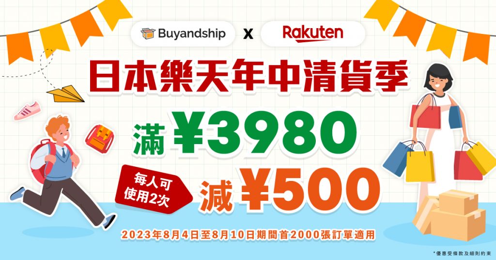 Buyandship會員 8 月獨家福利登場!於日本本土最大購物平台之一樂天市場(www.rakuten.co.jp)推出限量 2000 張的滿額即減優惠券,當中超過 50,000 間人氣店鋪參加,每個帳號仲可以最多使用 2 次,助力大家於8月的清貨季、返校季活動中買得更加盡興!