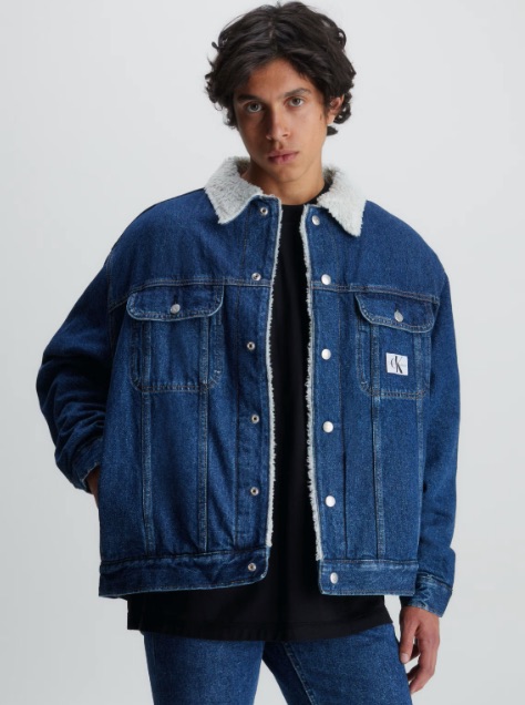 洗水深藍色調,90年代風格的硬挺全棉牛仔外套,胸部位置設有口袋並帶有 CK 標誌,頸部的毛毛領更添復古味道。
