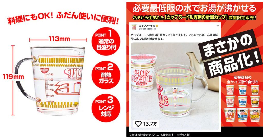 日本日清杯麵經常在 twitter 等社交平台推出各種天馬行空的日清杯麵相關商品企劃,引起了許多消費者的轉發與喜愛。而於2023年4月推出「杯麵造型量杯」想法短短時間已擁有超 13 萬喜歡,最終實體化開發成只送不賣的人氣週邊,是常吃日清泡麵的你一定要入手的品項!