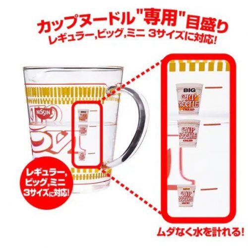 杯身設有不少巧思,為不同尺寸日清杯麵(標準、加大、迷你)所需水量設計的刻度。杯身採用耐熱玻璃製作,裝沸水也沒關係。