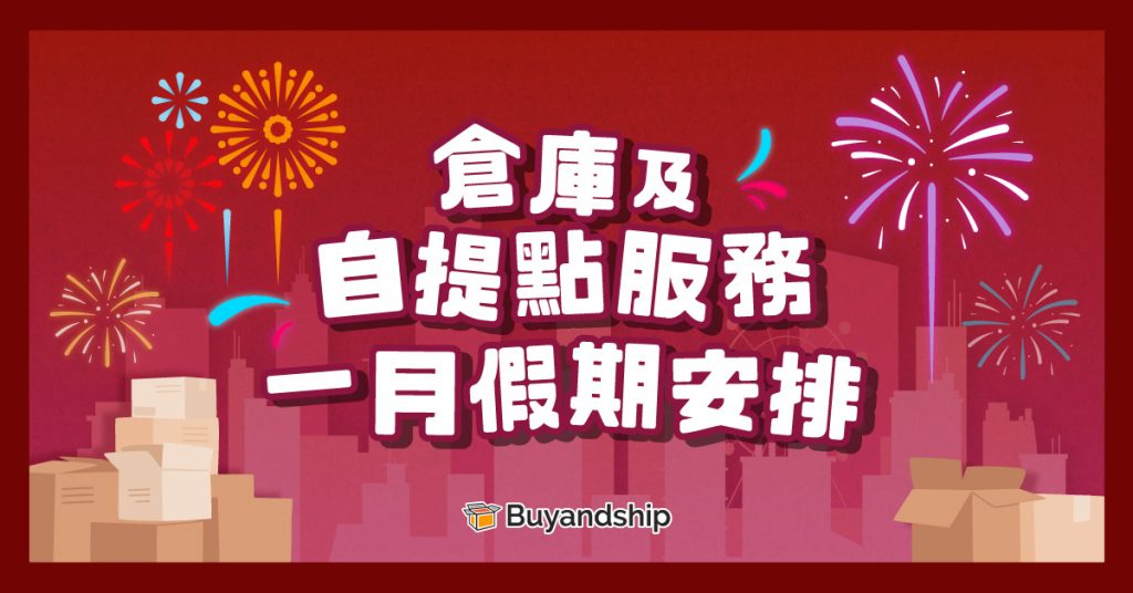 各地倉庫在一月將於當地公眾假期期間休息。倉庫休息期間將不會接收貨件、寄出貨件或更新貨件狀態。此外,各 Buyandship 自提點(包括加盟店)亦將於 1 月 1 日公眾假期當天休息,務請注意。