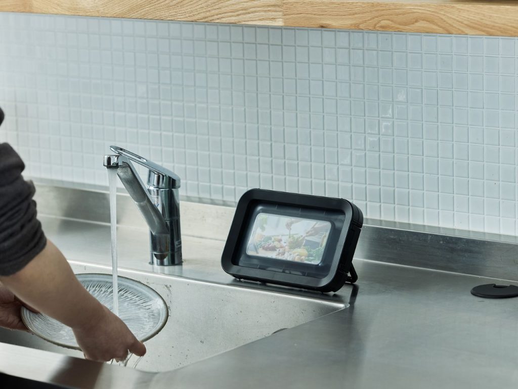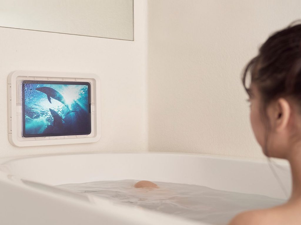 iPad 適用更大尺寸的可觸控防水盒,除了可以在吸附在浴室使用,還可以打開支架擺放於廚房,一邊洗菜洗碗一邊觀看影片,即使不小心浸入 1m 深的淡水中 30 分鐘也不會產生影響