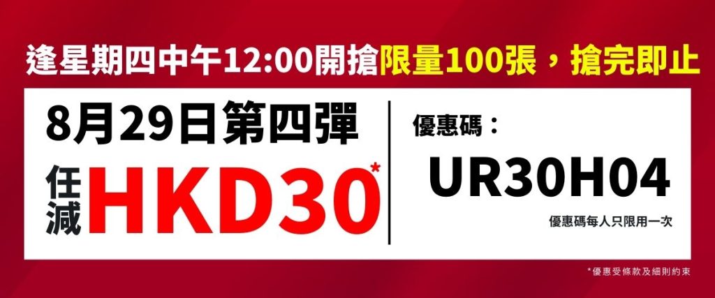從 8 月 8 日至 9 月 2 日,每週四中午 12 時發放限量優惠券,會員需輸入指定輕鬆購買優惠碼,搶無門檻 $30 優惠券,每位用戶每星期可用 1 次,並於每星期日晚 11:59 截止。優惠券只限名物商品可使用,用完即止!