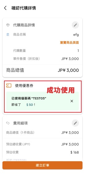 第 2 步:點擊「儲存」商品資訊後,於確認代購詳情頁輸入優惠碼「HKB4U38」,即可扣減 $38 金額,之後點擊「建立訂單」。