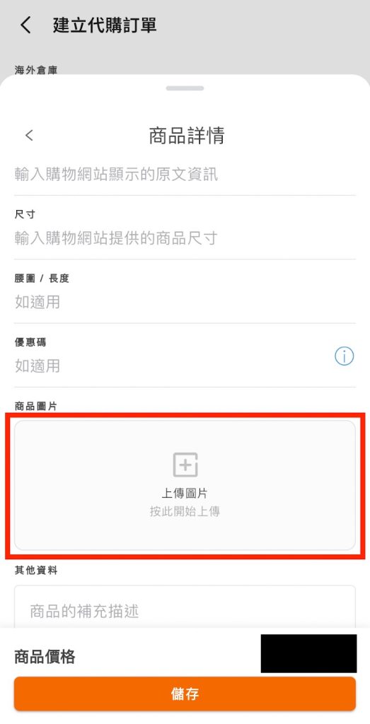第 1 步:點擊「建立代購訂單」並選擇你想代購的產品所屬地區後,填寫產品詳情並於商品圖片一併上載曾使用其他公司的代購證明。