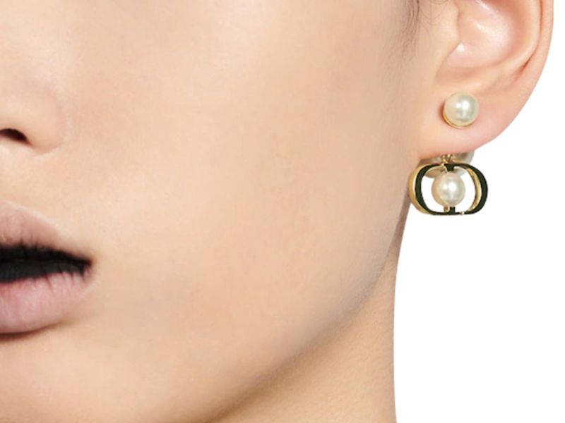 歐洲製造的白色樹脂珍珠搭配 CD 標誌,金色飾面金屬,後方亦搭配珍珠扣環。