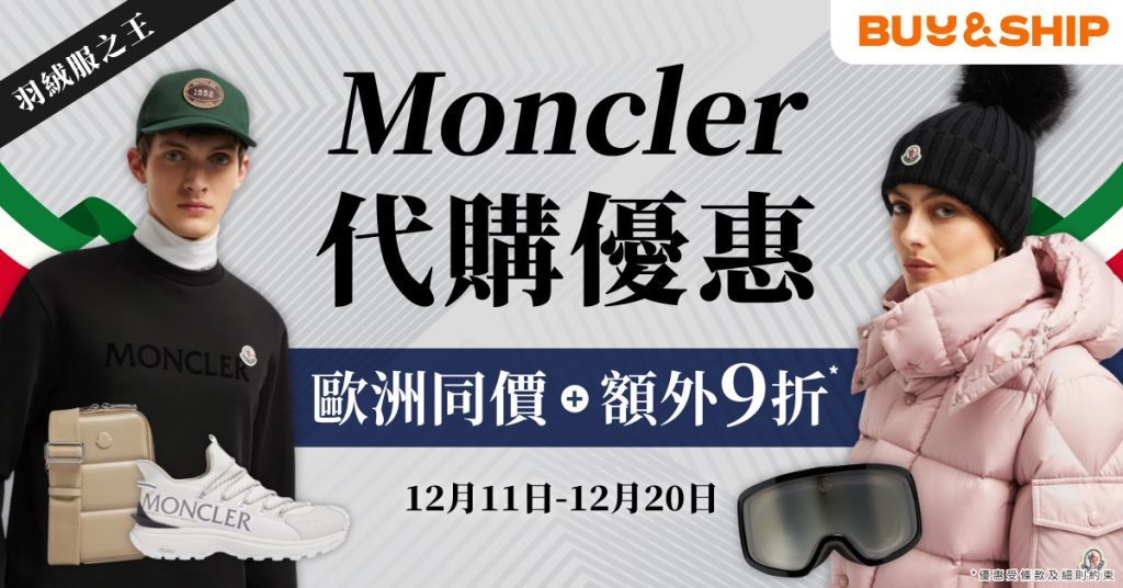 | 優惠內容 | 透過 Buy&Ship 代購服務購買 Moncler 意大利官網商品(網上限定產品除外),使用優惠碼「MONCLERHK」即可享全單 9 折優惠,優惠碼可無限次使用! |