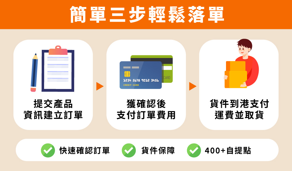待專員為你代購商品後,並會幫你申報貨件,待貨件出庫後,你只需到「會員中心」的「管理訂單」頁面進行合併和支付運費,隨後便能於自提點領取到你的代購商品或送貨上門。