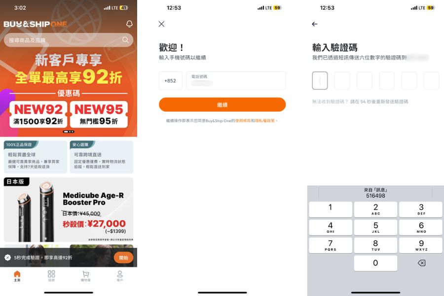 下載並打開 Buy&Ship One,輸入電話號碼並進行驗證以完成註冊!