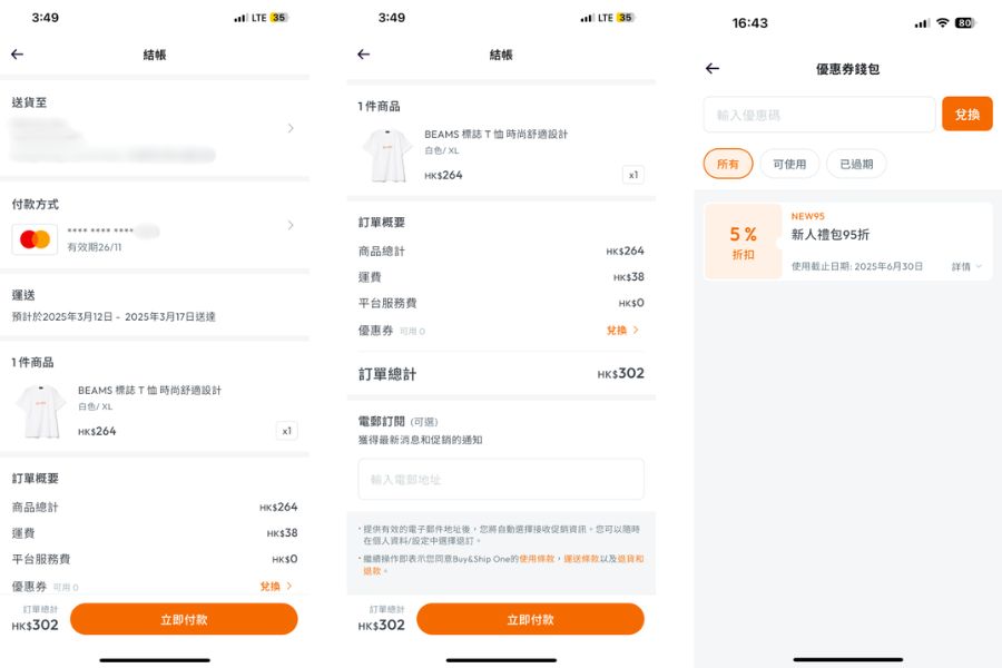填寫個人資料與付款方式,確認訂單及相關收費,並輸入優惠碼(如適用)。