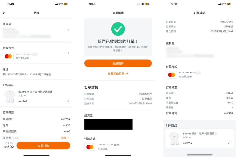 確認訂單後,點擊「立即付款」提交,運送進度可於「帳戶-我的訂單」查看。