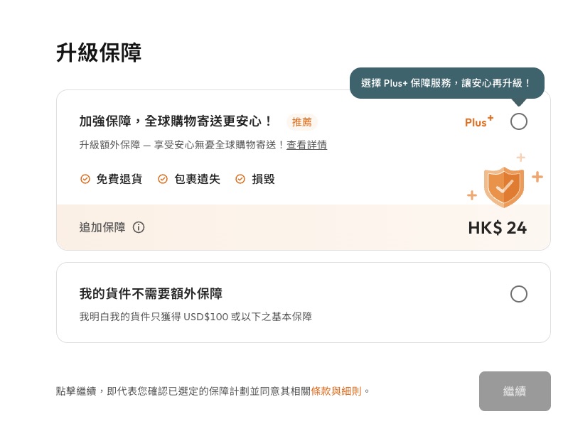 Step 8:選擇是否為貨件加購 Buy&Ship Plus 額外保障。完成選擇後點擊「確認」。