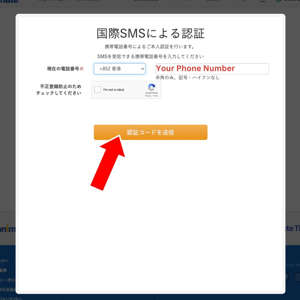 網站會要求用手機號碼進行 SMS 認證,按藍色「こちら」以使用海外號碼。