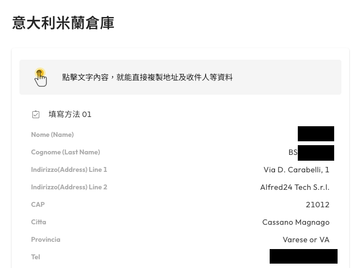 選擇「意大利米蘭倉庫」,便可以查看及複製 Buy&Ship 意大利倉庫的資料。