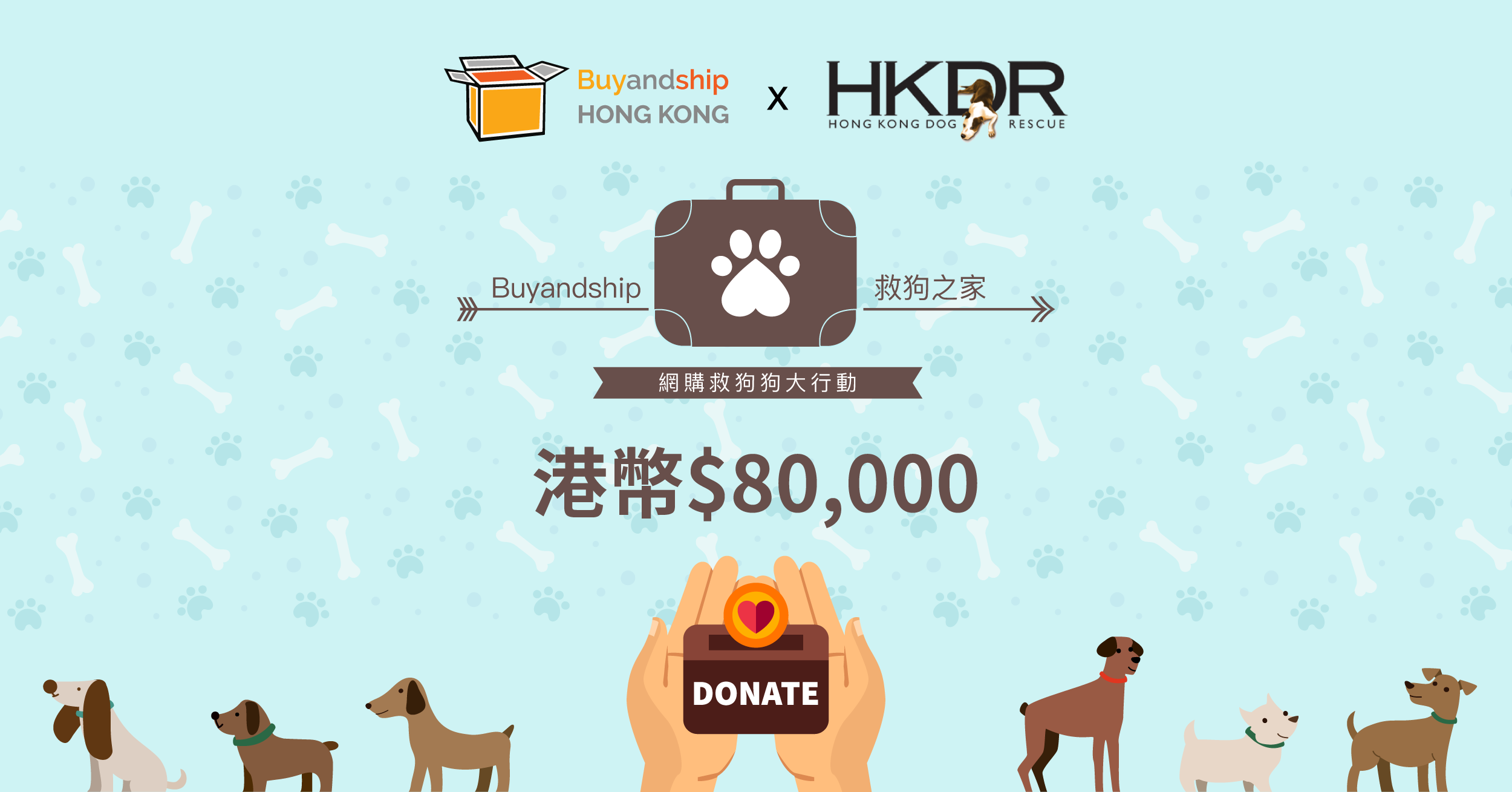 Buyandship 聯同 Hong Kong Dog Rescue (HKDR) 救狗之家合辦嘅「網購救狗狗大行動」已經圓滿結束,有賴各位嘅鼎力支持,活動期間我哋合共為救狗之家籌得港幣 $80,000 元正作為營運經費,希望可以幫助到狗狗快啲搵到愛錫佢哋嘅新主人。