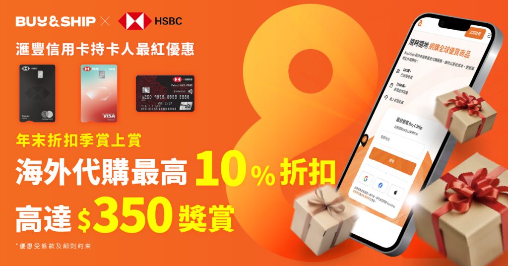 Buy&Ship 聯手滙豐信用卡推出限時優惠!即日起至 11月30日,不論是「海外代購」還是「日本 Mercari 代購」訂單,輸入指定優惠碼 並以 滙豐信用卡付款,最高可享10%折扣,合共高達HK$350折扣!全球限量、美妝、電子產品一網打盡!