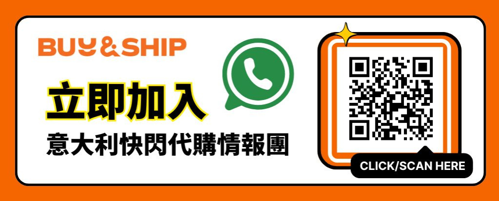 立即加入 「Buy&Ship 意大利快閃代購 WhatsApp 情報群組」,即時掌握意大利名牌連線最新報價,第一手優惠與產品資訊,有興趣千萬別錯過,隨時留意更新!